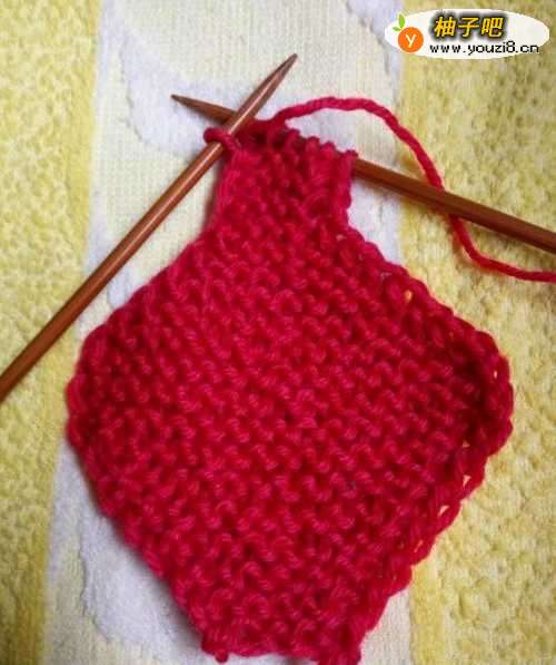 2开始起肤泪6针,正反面都织下针,每一排的开头和结尾都加一针。绕线加针或者在开头的第2针和末尾的一针的辫子上挑起一针织下针。