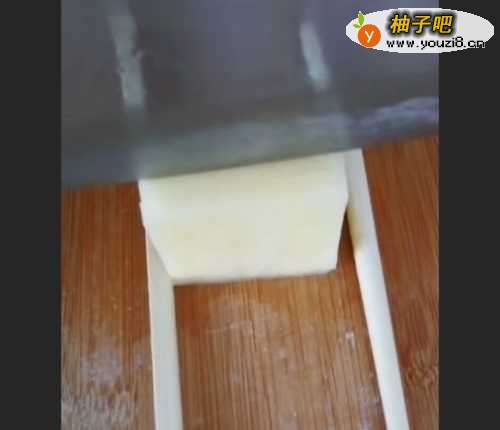 3将土豆改刀,卡筷子先横刀切,然后斜切数刀。片不要太厚。
