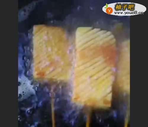 5竹签插好,下油锅炸,炸至金黄酥脆。