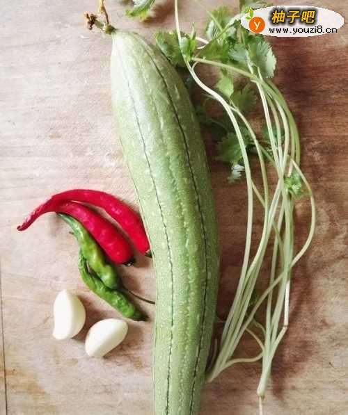 原料:丝瓜、蒜、红绿辣椒、香菜