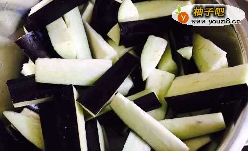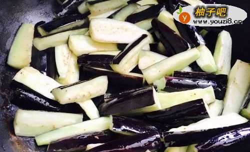 4接着另起一锅。锅里面多放一点油,然后把茄条倒进去油炸,炸软之后既可以捞出来备用。