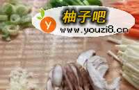 7依次放入胡萝卜及茭白丝翻炒至软后,再加入香菇,青椒,最后加入大葱及肉丝,