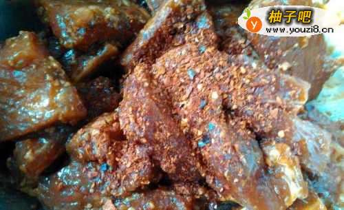 4排骨腌制好后放入辣椒面和花椒油拌匀(再放入蒸肉米粉调拌均匀,让每一块排骨都裹上米粉)