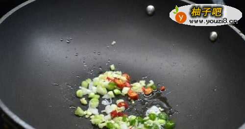 5洗净锅倒入少许油将青椒尖椒, 蒜蓉少许 葱白稍微翻炒下