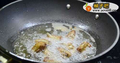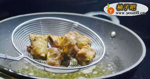 2热锅倒油7分热左右、将腌制好的肋排放入炸至微黄
