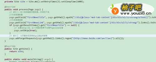 4PageProcessorDemo类开发内容如下图,每行代码均有注释,比较好理解。以某新闻页面为例,爬取新闻页面的第一条新闻的标题以及URL链接。内容比较简单,后续根据需求扩展增加。
