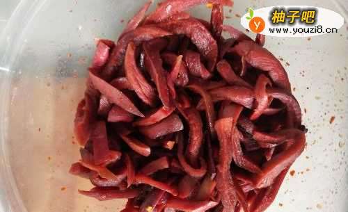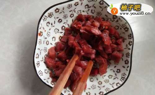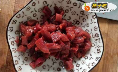 3如图,将萝卜干切成小小的丁状,大小要均匀才好看。