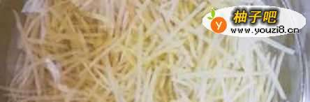 2把去皮土豆改刀成均匀的片,然后在切成丝用水冲去淀粉在漂起,同样把青椒和红椒也切成丝备用。