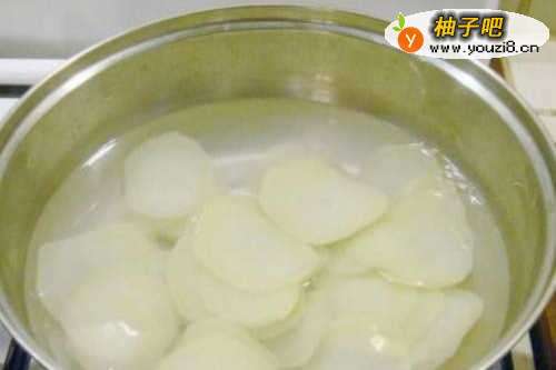 2锅中放水,放入土豆片,沸水煮两分钟