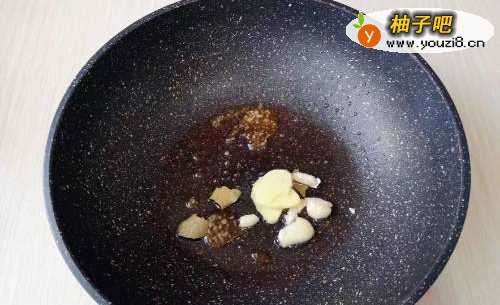 3待冰糖融化成为褐色时加入切好的姜片,蒜瓣炒香。
