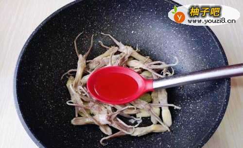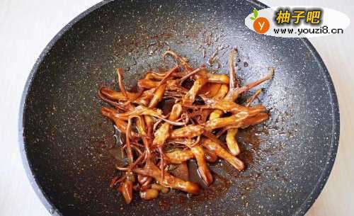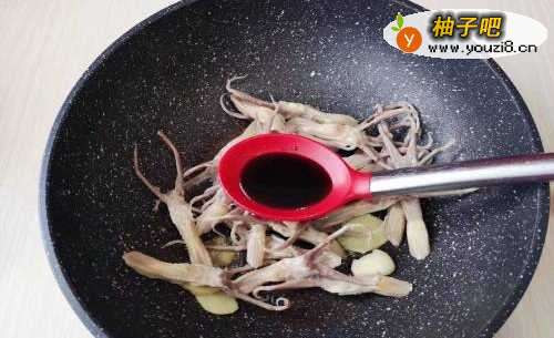 6加入生抽,老抽,翻炒均匀,至鸭舌均匀上色。