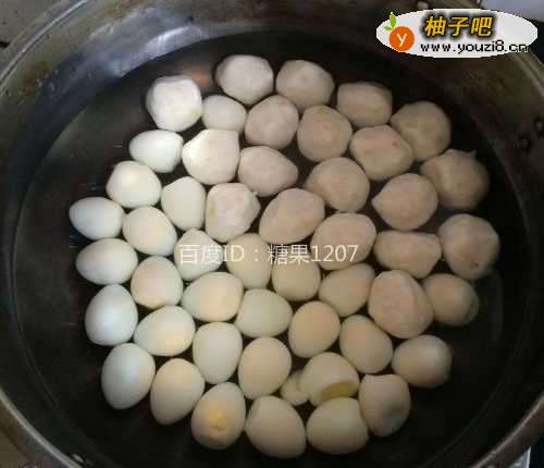 2烧一锅开水,将鱼丸和鹌鹑蛋倒入锅中。不用盖盖子,因为鱼丸会发的很大!不盖盖子便于观察。煮到图二就程度就好。