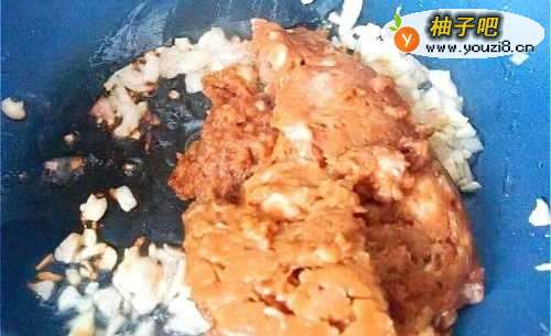 3下1汤匙油,烧热油锅,将蒜蓉、干葱蓉、朝天椒碎放入炒香。将猪肉碎放入炒至熟,攒入酒兜匀。