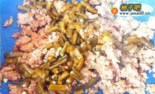 4把酸豆角放入炒匀,加入少许水分,转小火炒约2-3分钟至熟。
