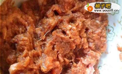 2猪肉洗净,用搅拌机搅碎,加入腌料,腌约30分钟。