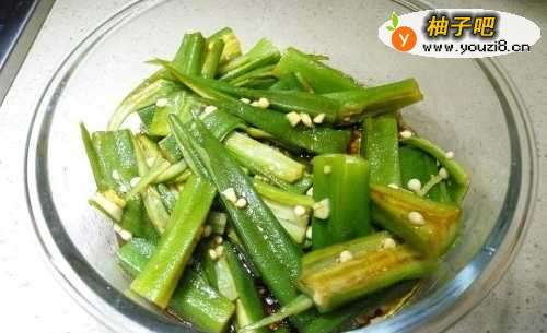 再把切好的蒜末倒到秋葵上面。