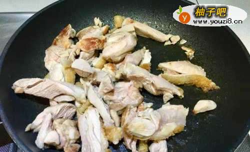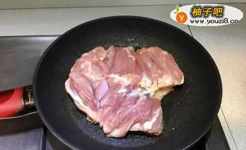 3热锅不加油,放入鸡腿肉皮朝下煎
