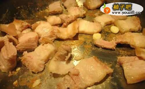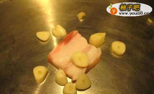 五花肉连皮切成薄片,先取一片比较肥的,和大蒜一起下锅,用中小火慢慢炸出油脂