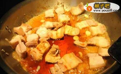 2接着再把猪肉下锅,转中火,煎到两面焦黄