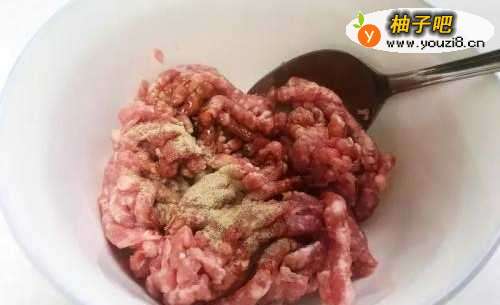 猪绞肉加入酱油、胡椒粉、糖、麻油、生粉拌匀,腌10分钟