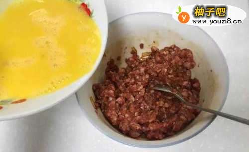 3猪绞肉腌好后,加入鸡蛋汁搅拌均匀