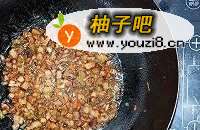 7猪肉丁用用油煸炒香,出荤油,放入葱姜蒜翻炒,加少许料酒,食盐和生抽,加豆腐干丁炒香,再放入炒烧肉丁,香菇丁,榨菜丁,胡萝卜丁翻炒均匀,炒熟