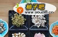 6准备好各种配料:叉烧肉丁,猪肉丁,榨菜丁,胡萝卜丁,豆腐干丁,香菇丁(水发香菇)葱姜蒜少许