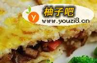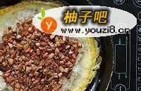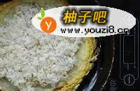 11糯米饭上面放炒好的馅子,也是尽量放均匀并且按压,使之结合的紧密一些