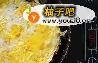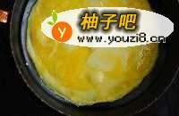 9豆面皮半成熟的时候,在上面磕一个鸡蛋,鸡蛋糊开,均匀的涂抹在上面,继续煎一会,然后翻面,把有鸡蛋的那一面用文火也煎一煎,还可以给锅中加少许油