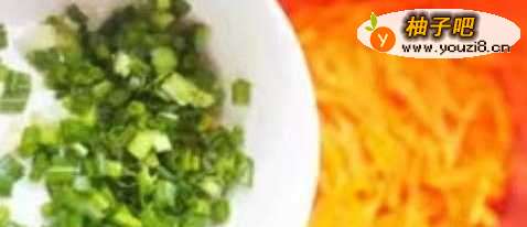 2香葱摘去老叶,洗净,切葱花。胡萝卜丝放入大碗中,加入葱花。