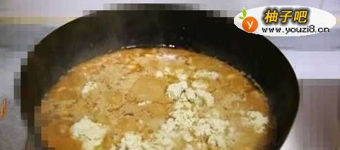 5等水沸腾一段时间后,把豆腐一点点的放入锅中,然后不停的翻炒,防止粘锅。使锅里成糊糊状。