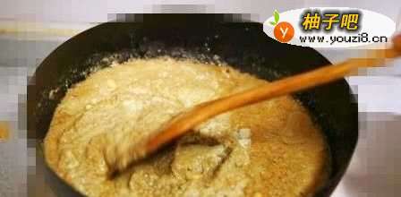 2当羊油煎成焦黄色时,倒入黄豆酱翻炒,直到有酱香味流出
