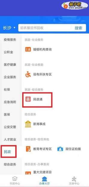 4点击民政分类,民政通项目。