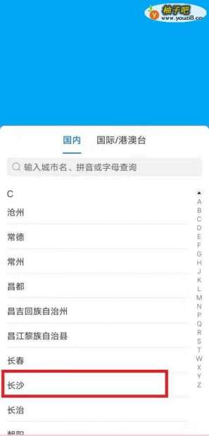 支付宝软件页面,切换所属城市长沙市。