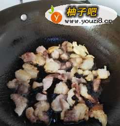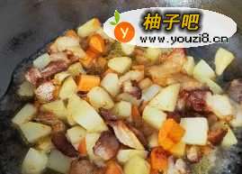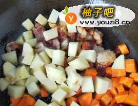 3爆好的猪肉里放入胡萝卜土豆,放入盐、耗油、酱油