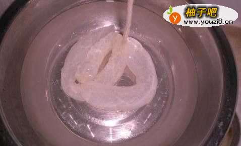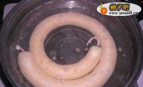 7将水烧到八九十度,将鸡蛋肠放入水中,中火煮,记得一定不要让水沸腾,一直保持在八九十度。煮十五六分钟