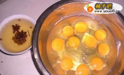 2准备一碗开水,泡上大料和花椒。十个鸡蛋打入盆中