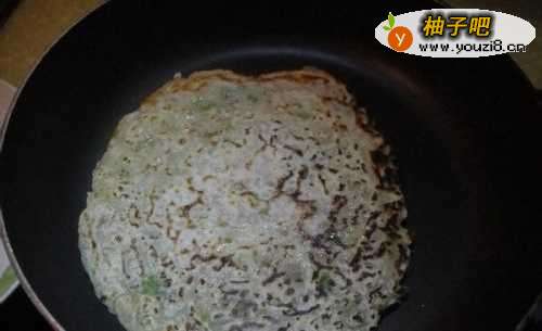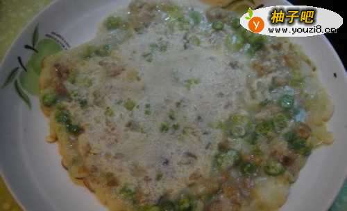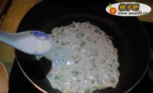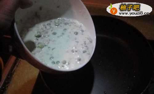 9把拌匀的豌豆肉糊倒入锅内