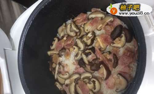 6把切好的腊肠和香菇,加入一点香油搅拌均匀,倒入刚刚洗好的米中,放入适量的水就可以开煮了;