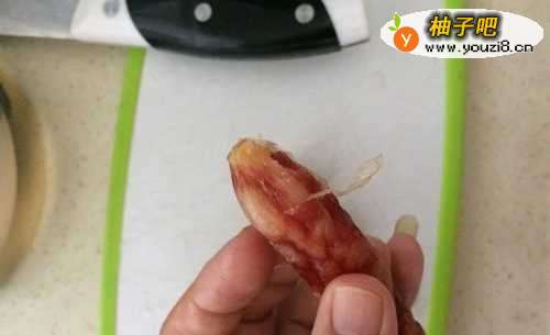 2腊肠撕掉外面一层薄膜(喜欢吃的也可以不撕),切小片备用;