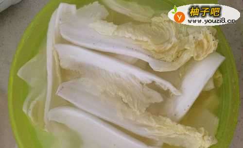 5娃娃菜摘叶,用刚刚的淘米水浸泡一下后撕小片冲洗赶紧备用;