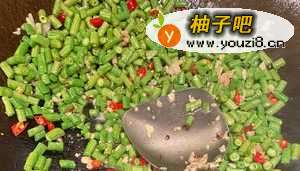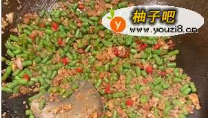 3肉末炒出的油再加点油加入小米椒和蒜末炒香后,加入洗干净切粒的豆角大火爆炒,两勺料酒两勺酱油锅边淋入炝锅,水分干了即时补2-3勺水,大概全程大火翻炒五分钟左右,这五分钟内看情况补水