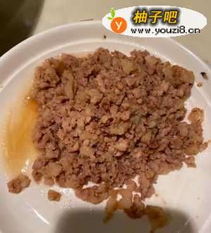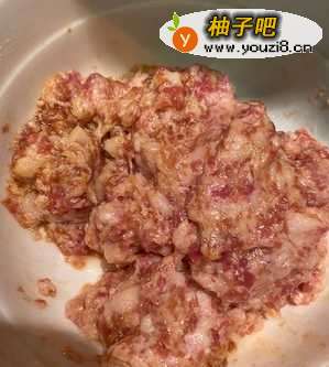 半肥瘦的猪肉末。加一勺料酒一勺生抽半勺蚝油半勺糖一勺淀粉腌制10几分钟。(也可以不腌,后续调味加重)