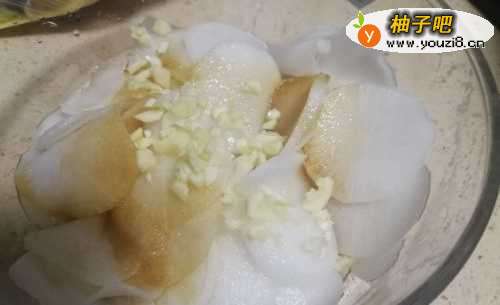 4再来点蒜末、姜末(我不喜欢辣椒,喜欢吃的来点小米辣),一点开水漫过萝卜即可。