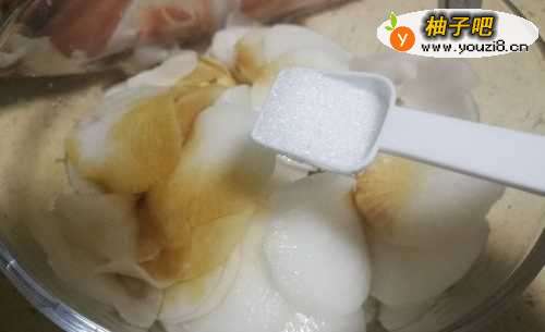 1、萝卜去皮切片,放盐腌制1小时。