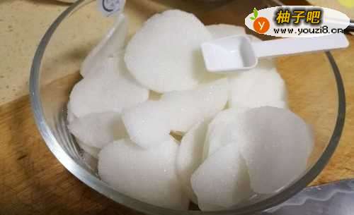 2切成薄片放盐腌制一个小时,杀出萝卜里的水分。