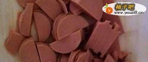 3之后,把火腿去掉包装,也从中间切开,在切成一个个的小块,如下图所示。