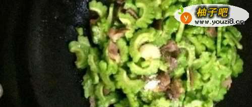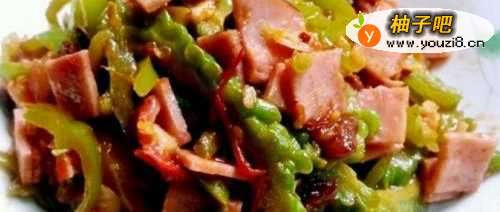 5接着,把火腿先放进去翻炒大约1-2分钟,之后加入苦瓜条,继续翻炒,期间加入盐,花椒粉,醋等调味。