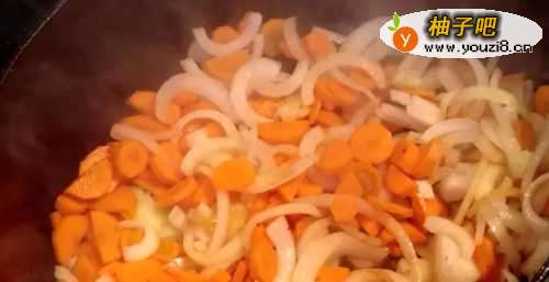 6放入洋葱、红萝卜和蒜头,拌炒均匀后,再加入一茶匙的香料、柠檬皮、番茄膏、番茄酱,拌炒一下。