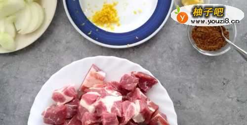 4蒜头剥除外皮后,用刀背压扁。冷冻过后的蒜头会比较容易剥掉外皮。将洋葱切丝、红萝卜切片、削点柠檬皮削、肉切成块,依喜爱的大小即可。